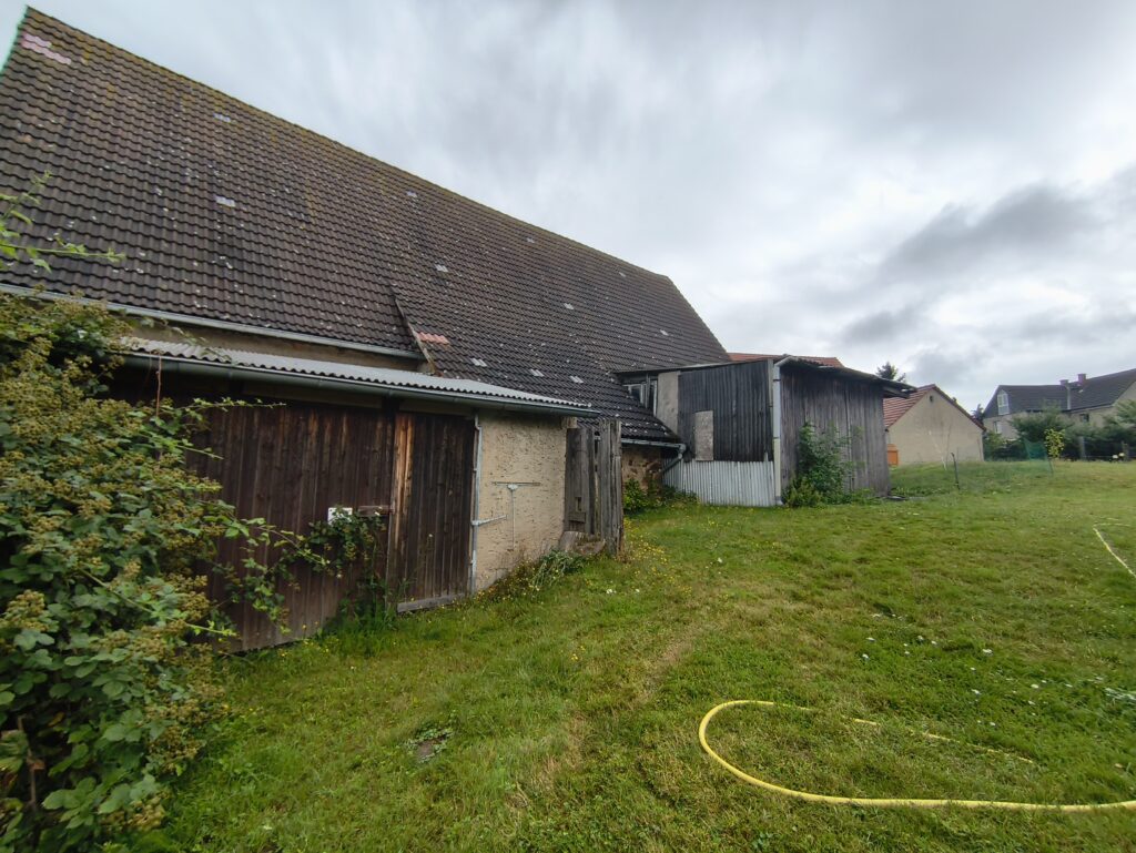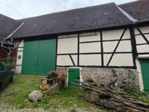 Unser Hof besteht aus zwei Seitengebäuden, einer Fachwerkscheune, die stolz die Jahreszahl „1810“ trägt, mit einem Satteldach und einer Toranlage – ein echtes Zeitzeugnis! Die Wirtschaftsgebäude sind zweigeschossig, mit massivem Erdgeschoss und charmantem Fachwerk im Obergeschoss, dazu Holztraufe und Satteldach. All das erzählt von der bäuerlichen Wirtschaftsweise vergangener Zeiten.